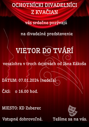 Divadelná veselohra v troch dejstvách od Jána Kákoša. Obec Zuberec a Ochotnícki divadelníci z Kvačian vás srdečne pozývajú v nedeľu 7. januára 2024 o 16.00 hod. do Sály kultúrneho domu v Zuberci na divadelné predstavenie Vietor do tvárí. Vstupné dobrovoľné.