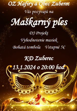 OZ Hafiry a Obec Zuberec vás pozývajú v sobotu 13. januára 2024 o 20.00 hod. do Kultúrneho domu v Zuberci na Maškarný ples.