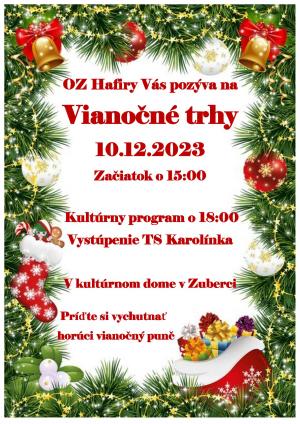 OZ Hafiry Vás pozýva na Vianočné trhy, ktoré sa uskutočnia 10.12.2023 od 15.00 hod. v Kultúrnom dome v Zuberci.