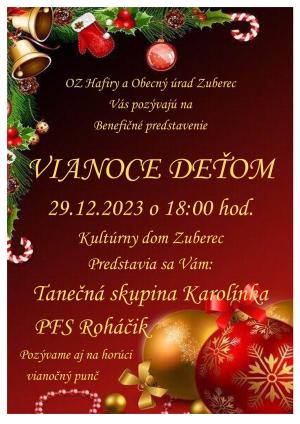 OZ Hafiry a Obecný úrad Zuberec Vás pozývajú v piatok 29. decembra 2023 o 18,00 hod. do Kultúrneho domu v Zuberci na Benefičné predstavenie VIANOCE DEŤOM.