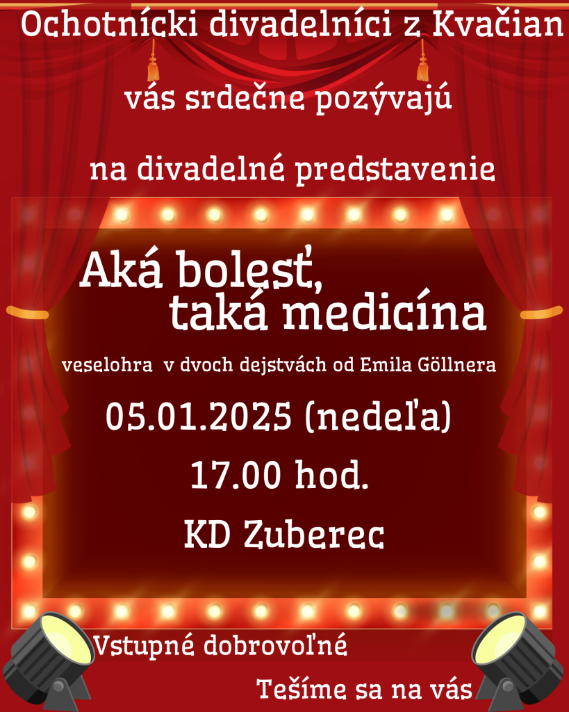 Ochotnícki divadelníci z Kvačian a Obecný úrad Zuberec vás srdečne pozývajú v nedeľu 5. januára 2025 o 17.00 hod. do Sály kultúrneho domu v Zuberci na divadelné predstavenie.