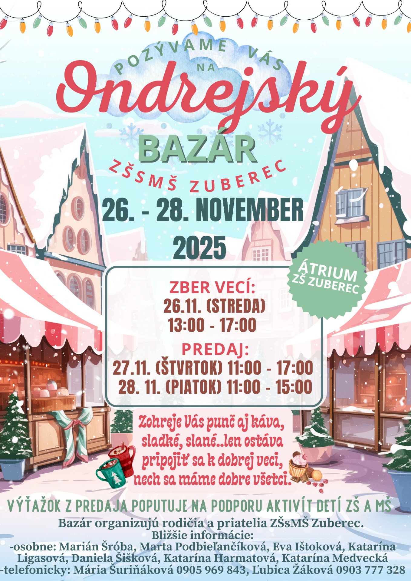 Pozývame vás na Ondrejský bazár, ktorý sa uskutoční 27.11 (štvrtok) 11:00 - 17.00 hod. a 28.11. (piatok) 11.00 - 15.00 hod. Veci na predaj sa budú zbierať 26.11., t.j. v stredu v čase od 13.00 - 17.00 hod. Výťažok predaja poputuje na podporu aktivít detí ZŠ s MŠ v Zuberci.