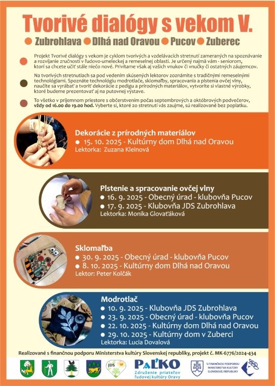 Projekt z cyklu vzdelávacích stretnutí, zameraných na spoznávanie a rozvíjanie zručností v ľudovoumeleckej remeselnej oblasti. Je učený najmä seniorom, ktorí sa chcú učiť stále niečo nové. Vítaní sú aj vaši vnukovia, či vnučky aj ostatní záujemcovia. Lektorka: Lucia Dovalová