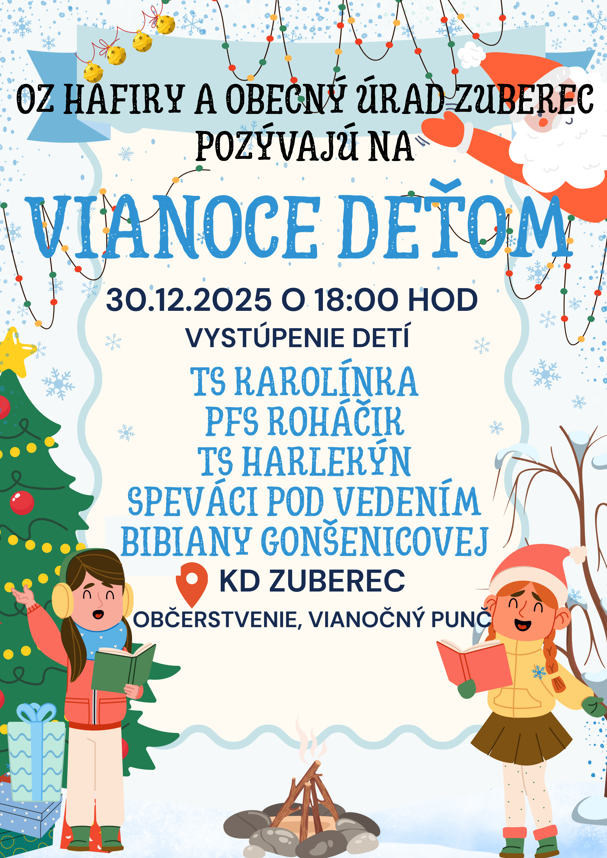 OZ Hafiry a obec Zuberec Vás v utorok 30.12.2025 o 18.00 hod. pozývajú do kultúrneho domu na vystúpenie detí Vianoce deťom.
